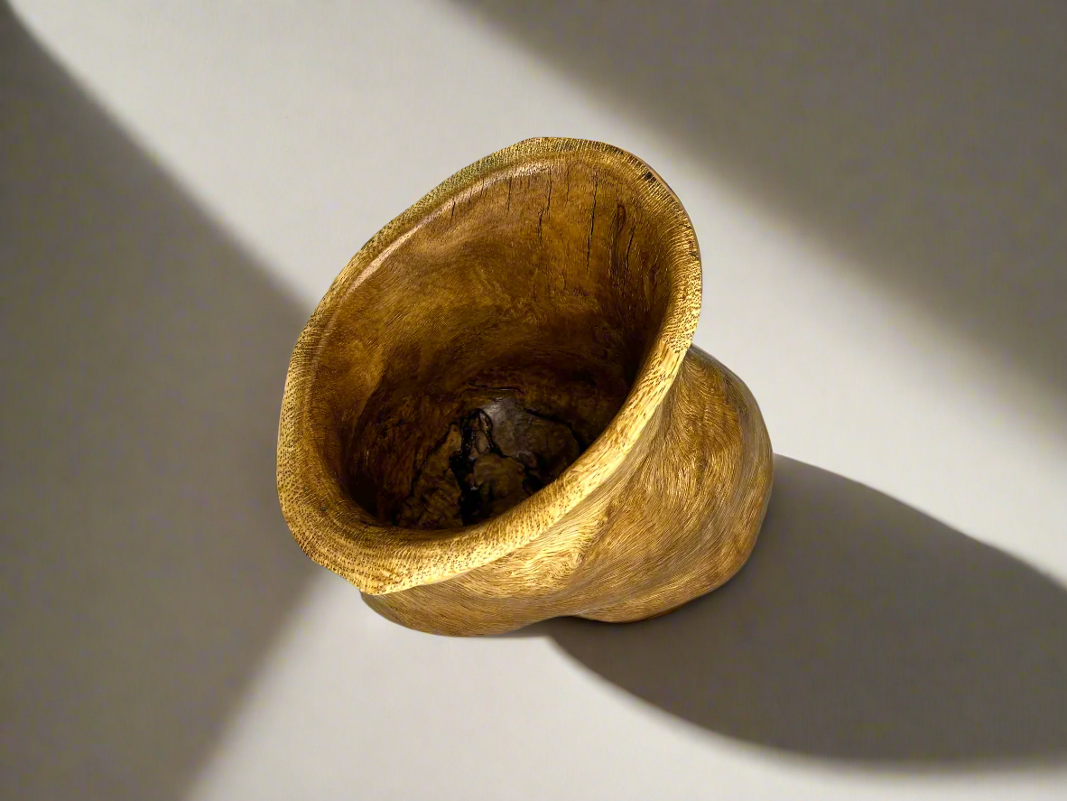 Crafted from rare jack pine, this burl bowl features mesmerizing swirling long grain patterns and deep, captivating interior features that make each piece truly unique. The cracks featured on the inside of the bowl add a touch of rustic charm while showcasing the natural character of the wood. Perfect for both functional use and as a striking centerpiece, this bowl is a stunning testament to fine craftsmanship and the exquisite beauty of natural wood.